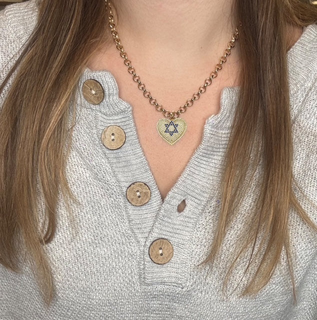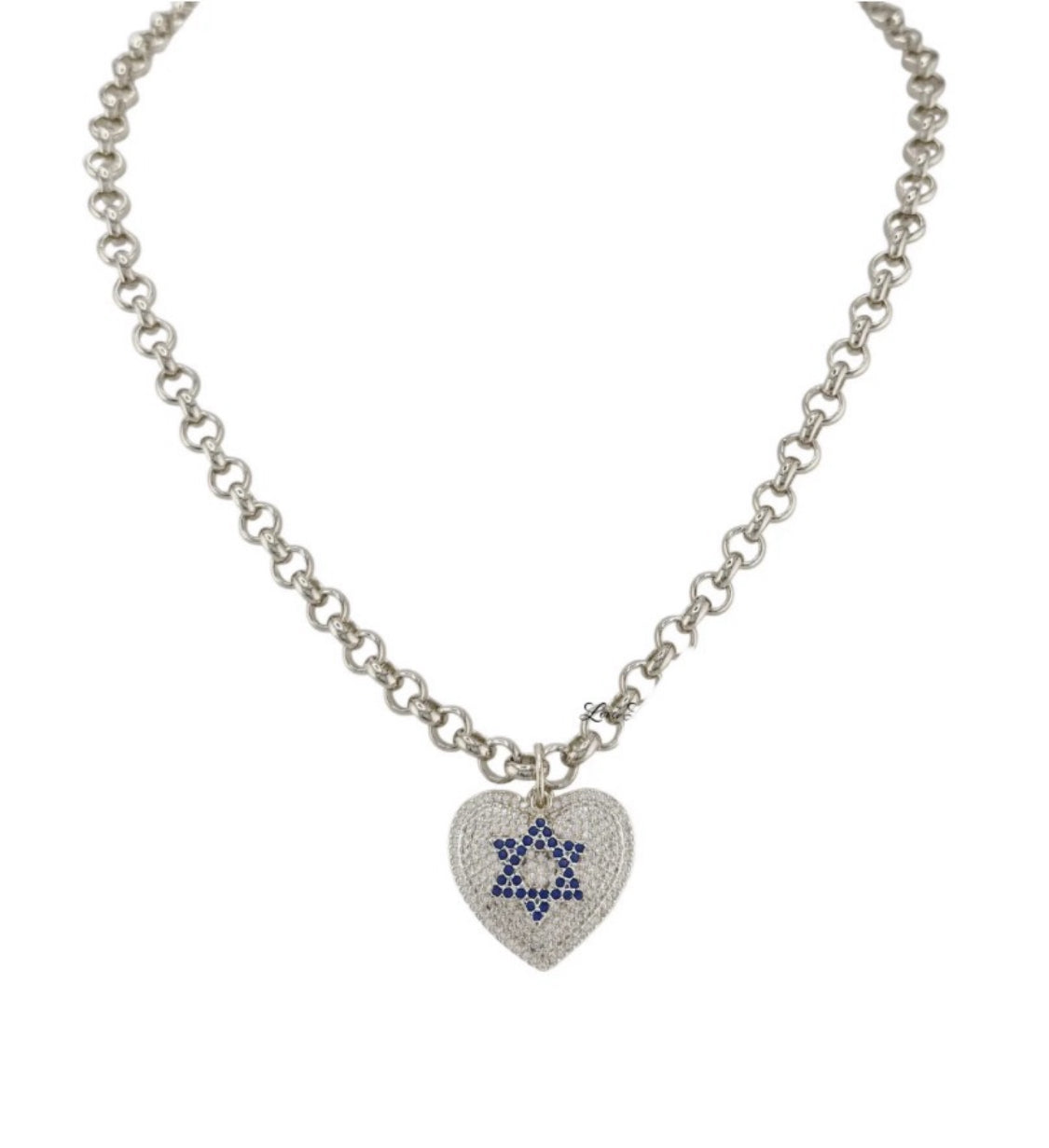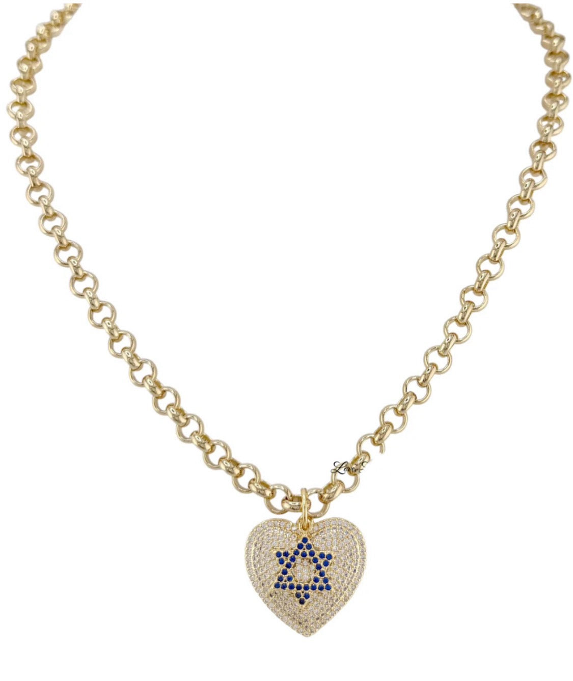 This necklace blends meaning with a bold, modern look. The heart pendant is covered in sparkling pavé stones and features a blue Star of David at the center, giving it a symbolic touch that stands out beautifully against the chunky link chain. It’s finished with a secure lobster clasp and measures 17 inches for a classic fit that sits perfectly at the collarbone.